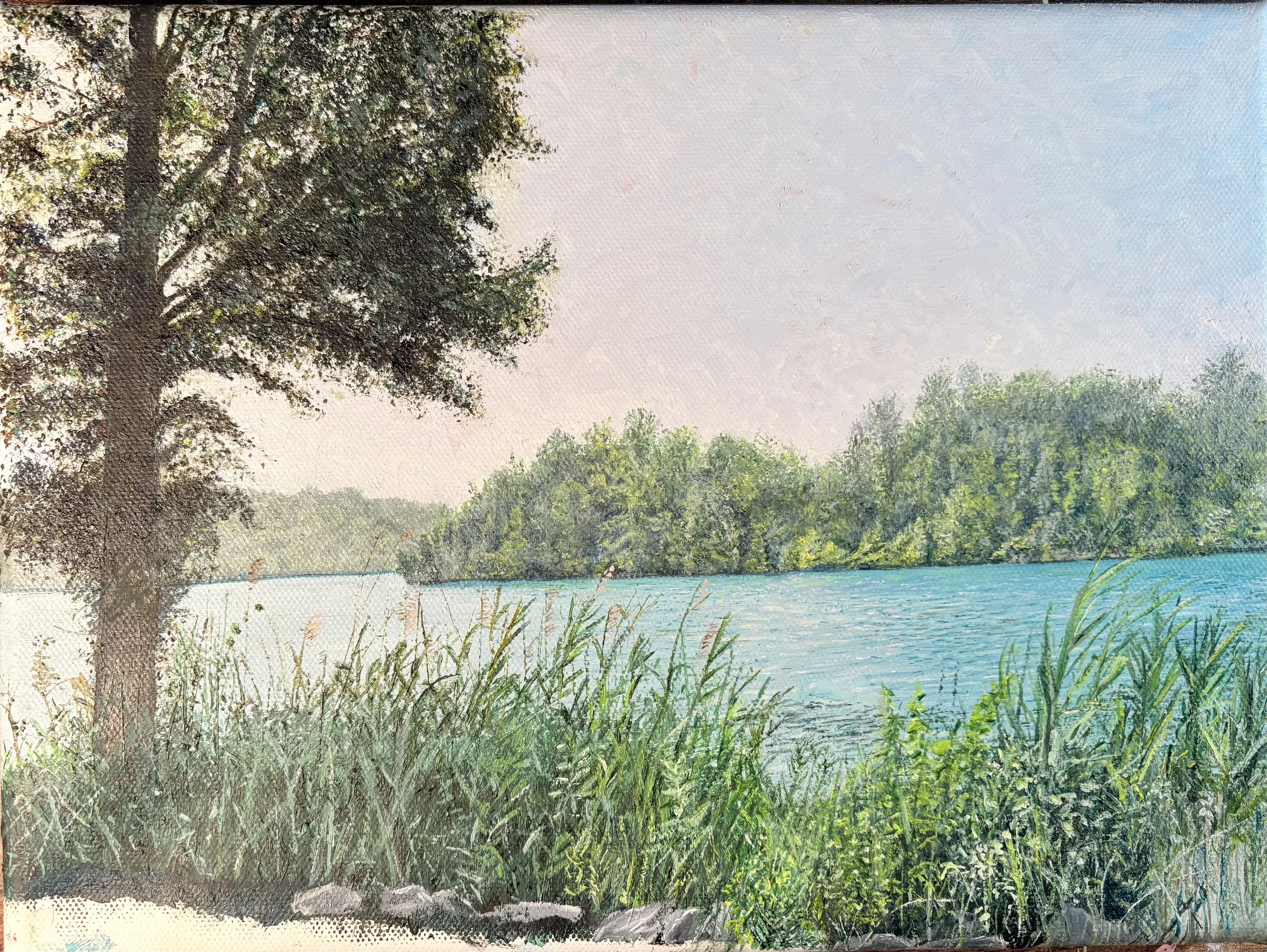 Progress for an impressionism oil painting based on the Green Lakes photo: